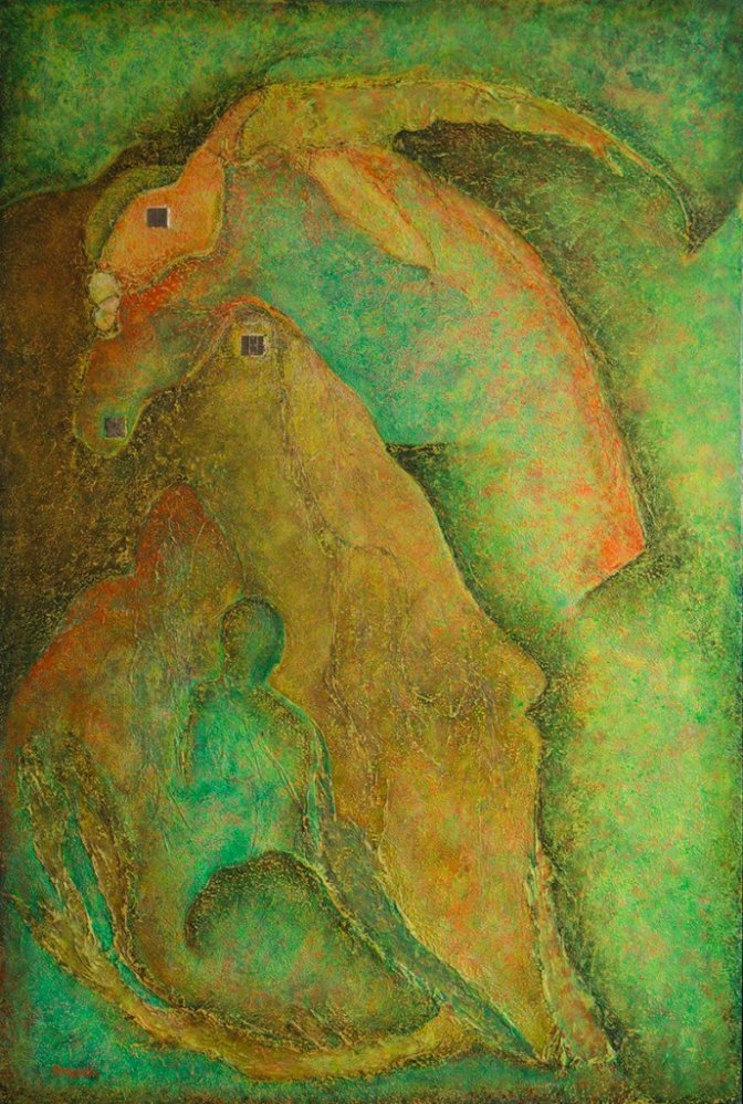 Conçue initialement dans un espace féminin, lieu d’intenses partages sur des thèmes aussi divers que la sororité ou l’enfantement, cette toile mystérieuse utilise des formes animales, des motifs ornementaux végétaux. Les poids Akan servaient à peser l’or, mais ils étaient décorés de symboles propres à l’Afrique de l’Ouest, l’artiste exprimant ici l’union et la fécondité [1]. On ne sait pas trop bien quel accouplement est représenté, des humains, des non-humains, des figures, mais l’œuvre évoque la force et l’énergie de la vie.