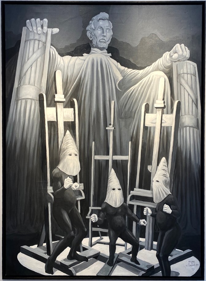Le tableau grand format à l’accueil est le plus iconique : il représente Lincoln assis monumentalement, impassible, dont on sait pourtant que la politique abolitionniste était très ambiguë , à ses pieds trois chevalets de peintre, organisé comme un Golgotha, et trois figures du KKK dansant, the Facts of Life : le Klan est apparu quelques mois après l’assassinat du président républicain en 1865.