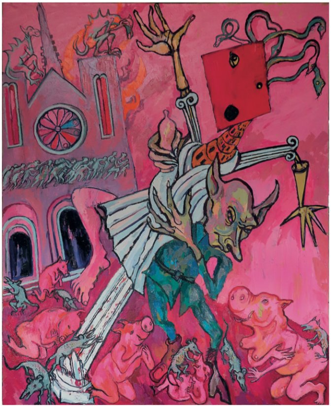 Le fond rouge exprime la gravité de la situation : un incendie, non pas du monde, mais du continent européen et de sa culture représentée par la cathédrale que l’on retrouve dans le tableau « Merry Cathedral » offert à l’église Saint-Merry en 2015, avec la frise d’une foule partant en exil. À la place des gargouilles figurant le mal, des dragons sur les tours en surplomb regardent les effets de l’incendie.