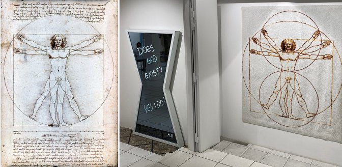 Pistoletto va ensuite simplifier et utiliser deux triangles qui dessinent les jambes et les bras écartés. Il crée un univers pour cet homme : un lit, une porte, un radiateur, un banc en fer, une table en cristal et acier et trois tapis avec le dessin de Léonard, de face.