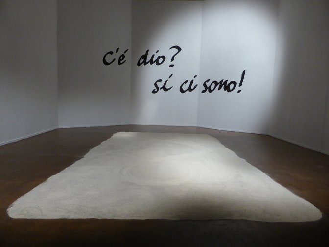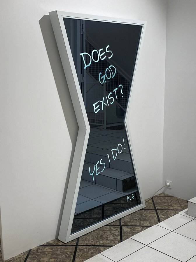 Une étrange boîte lumineuse noire intrigue, car cette œuvre est double : le cadre est très particulier, deux V inversés, le signe de « Segno Arte » et l’inscription « Does God Exist ? Yes, I Do ! », (Dieu existe-t-il ? Oui, moi j’existe, 1976-1997) peinte par Michelangelo Pistoletto, tel un graff de rue. Cette affirmation-manifeste reflète l’image du spectateur, un classique des œuvres de l’artiste, et l’empêche d’échapper à la question.