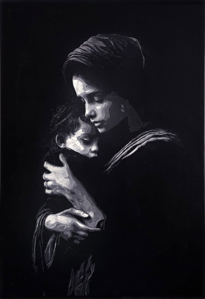 Ce jeune peintre, dont la notoriété croît dans la sensibilité religieuse d’aujourd’hui, (lire : Une peinture psalmiste est bien sûr présent avec ses réinterprétations du clair-obscur poussé à son extrême puisque le noir dans son épaisseur est la teinte majeure sur laquelle l’artiste vient déposer des taches blanches et signifier une lumière intérieure. « Son couteau enduit de blanc vient ciseler l’obscurité […] taillant dans un bloc de ténèbres comme le ferait un sculpteur dans un bloc de marbre. »
