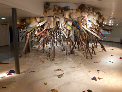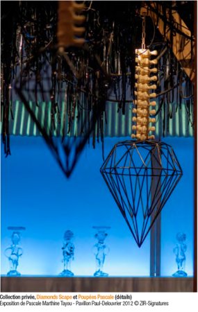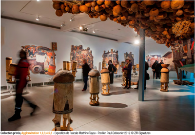 Au pavillon Paul Delouvrier, vous trouvez des installations foisonnantes, parfois mouvantes et bruissantes de chants d’oiseaux, de murmures, d’échos urbains…Mais aussi des masques, totems de "Poupées Pascale" en cristal où des formes africaines s’incarnent dans le raffinement du travail des maîtres verriers italiens ; "Les Troubadours", orchestre de tambours camerounais métamorphosés en saltimbanques unijambistes ; des cases de bois, tableaux, photographies…Loin d’être une œuvre de délire, l’ensemble semble puiser ses références dans les œuvres des grands maîtres jusqu’au registre pop.