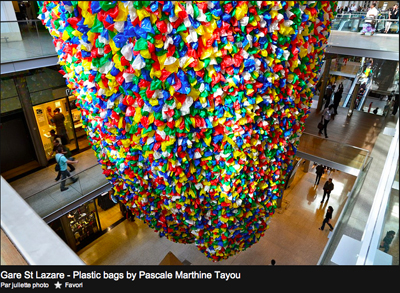 Si vous ne connaissez pas Pascale Marthine Tayou, vous avez pourtant côtoyer l’une de ses œuvres manifestes à la gare Saint-Lazare, au milieu de la salle des pas perdus : une immense bulle, en fait un filet, sur laquelle sont accrochés plus de 3 000 sacs poubelle, image d’un monde où le gaspillage est partout, mais qu’il transmue en montgolfière imaginaire piégée par la voûte de la gare accueillant désormais la lumière.