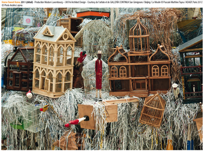 Le thème de la ville est omniprésent, dès la première pièce « Home sweet home ». Formée de cages à oiseau, de nichoirs et de spaghettis de papier amassés sur des troncs d’arbre, cette ville chaotique fait penser à ces villages de boat people, dont la mer se serait retirée ; ce qui fait encore tenir cette forme urbaine c’est la solidarité des maisons entre elles et en-dessous du sable. Et de tout cela surgissent des chants d’oiseau ! Une version de « sous les pavés de la mondialisation urbaine, la plage ».