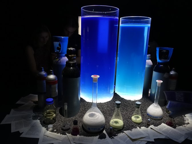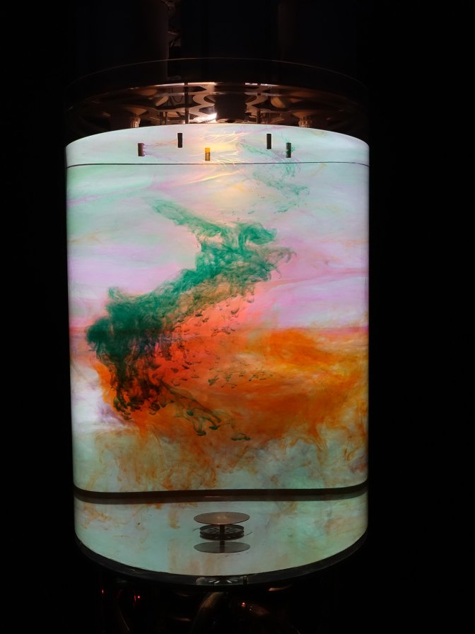 Deux installations réalisées par Renaud Marchand faisant référence à « Possibilités d’une île » aèrent le parcours avec des volutes de couleurs dans de l’eau.