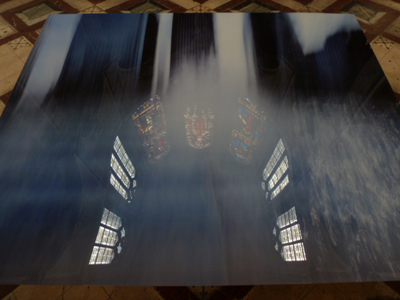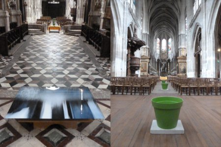 Au lieu d’être accrochée, la photo est posée sur un meuble bas, presqu’à l’horizontale au pied de l’autel. En effet, elle est légèrement inclinée vers le chœur. Visuellement l’eau semble couler vers une autre œuvre dans la grande nef : quatre grands pots verts qui recueillent des gouttes d’eau provenant de la croisée du transept.