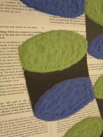 Lob Koelewijn (né en 1962 et vivant à Amsterdam) proposa « Nursery piece » (2010), une peinture de sable où les pigments étaient mélangés à de l’eucalyptus, le tout sur des pages de l’ouvrage fondamental du philosophe Baruch Spinoza (1632-1677), l’Ethique. Sans nul doute, il s’agissait d’un mandala même si l’œuvre était fondée sur une autre géométrie.