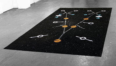 « L’œuvre, réalisée avec des poudres brillantes, renvoie aux peintures de sable des populations natives de l’Amérique du Nord. Elle représente un diagramme atomique du cycle proton-proton. Ce processus chimique, qui transforme l’hydrogène en hélium, a lieu dans les étoiles, tel notre soleil, et il constitue une explication contemporaine de l’origine de l’énergie de notre planète ».