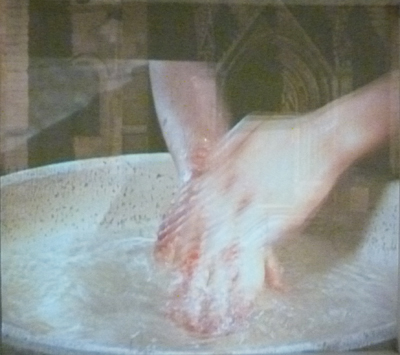 Une vidéo en boucle composée de quatre plans séquence : des mains, un corps penché, des cheveux. De cet autoportrait de l’artiste, on n’apprend rien hormis cette volonté obsessionnelle de faire disparaître une tache invisible par une eau limpide.