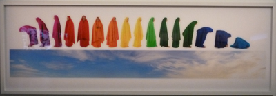 La splendide composition photographique d’Arwa Abouon (Libye) représente, de son côté, un horizon à la Jan Dibbets ou un ciel nuageux relevant de la plus pure tradition occidentale. Au-dessus, une femme en burqa, arc-en-ciel et non noire, puisant dans la symbolique des coloris gay. Son mouvement est décomposé de façon élémentaire comme dans les photos de Muybridge, qui, en 1878, étudiait le marcher de l’homme nu ou le galop du cheval. Dans ce mouvement où elle bascule progressivement dans la prière, tout est évoqué à la fois : l’attitude religieuse traditionnelle, la place de la femme arabe et l’espérance des bombes humaines dans l’au-delà. L’ambiguïté ironique féministe est ici poussée très loin mais ne peut heurter personne.
