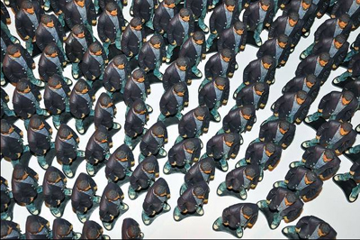 Les photos sur le mode des écrans de contrôleurs des aéroports, non plus des bagages mais des formes humaines préfigurant les futurs scanners corporels souhaités par les Américains sont les fondements de l’œuvre de Maha MALLUH (Arabie Saoudite) « Barcoding I et II ». L’installation faites de cercueils contemporains présentés sur le mode de découvertes d’archéologues de l’an 3000 est réellement lugubre et semble exprimer plus qu’un délire d’artiste !