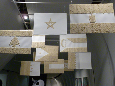 En revanche, Safaa Errus a recréé les 22 drapeaux de la Ligue Arabe avec des perles crème sur des tissus blancs. Tous identiques ! Une représentation selon les codes esthétiques vestimentaires anciens, doucereux et clinquants… Le contraste entre cette représentation symbolique et la réalité de pays autoritaires est si grand qu’il prête à sourire.