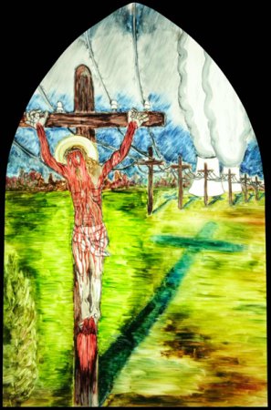 – La crucifixion : le Christ est crucifié sur de vieux poteaux électriques des années 50-60 dans un paysage tranquille où les nuages passent paresseusement avec en arrière-plan deux centrales nucléaires crachant leur volutes blanches. Cette introduction décalée de la mort du Christ dans notre temps contemporain serait presque étrangement paisible, jusqu’à ce qu’un événement se produise : un court-circuit secoue le supplicié et du sang sort de ses mains et ses pieds (et non de son côté comme il est écrit dans les Textes). Comme dans la scène précédente, le fluide rouge coule à flot et recouvre le corps. Puis tout s’arrête, le corps sur la croix reprend son aspect de départ.