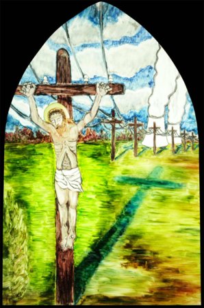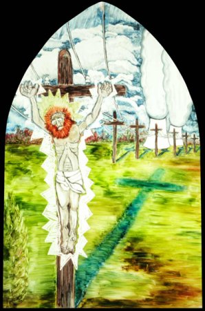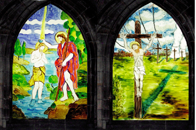 Cette œuvre réjouit les enfants mais peut heurter paradoxalement la sensibilité des adultes : un Christ dont le baptême ressemble à une douche, une « crucifiction » sur des poteaux électriques et un Christ qui meurt dans la violence. Cette œuvre flirte avec l’hubris, l’excès et la « bad painting ». Une église aurait-elle la légitimité à ouvrir des sujets aussi sensibles à une forme aussi contemporaine de l’art ? Oui certainement, et ici le jubilatoire s’ancre dans la profondeur et réveille le visiteur.