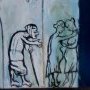 Deux représentations du Christ, l’une est une mise en croix, l’autre la mise au tombeau dans le dénuement. Un homme, fils de Dieu, qui s’est donné totalement. La crucifixion est un thème souvent repris par l’artiste, sensible à la question de la souffrance humaine. Ces représentations font référence à un autre puissant tableau de l’artiste rarement exposé, une crucifixion jaune.