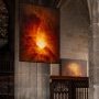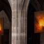 Dans le premier triptyque, un peu plus dans l’ombre (à droite dans la nef), la lumière/faisceau déchire les ténèbres (Overscheyt n°1), se transforme en flamme (Overscheyt n°2) et conduit à un premier espace où des paysages possibles émergent (Overscheyt n°3). Les photos expriment ici le caractère centrifuge de l’énergie de la lumière.