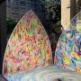 « Les couleurs innocentes de la paix ». Cette installation d’été 2023 à la Galerie Saint-Séverin explose de dynamisme fluorescent et dialogue avec l’église située en face.