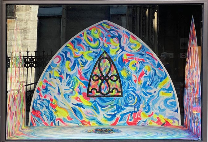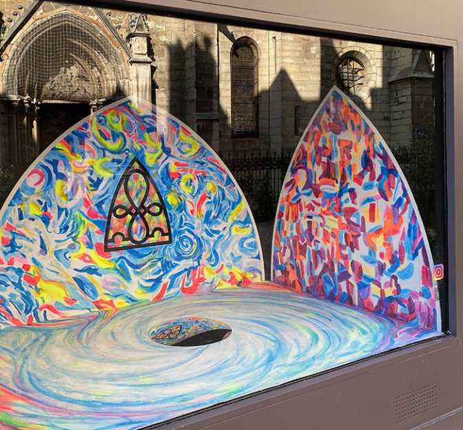 Étonnante vitrine Galerie Saint-Séverin. Il y avait fort longtemps que l’on n’y avait plus vu des œuvres aussi religieusement connotées, le nom de la galerie prend de ce fait une actualité artistique déclarative. À l’éblouissante et mystérieuse toile monocolore dorée précédente de Thibault Lucas >>>(mai 2023), succède une œuvre de commande inspirée par la présence de splendides vitraux de Bazaine dans l’église en face. La courbure en verre coloré ayant pour thème les sept sacrements, conçue en 1964 pour les chapelles absidiales, a largement inspiré cette maquette peinte de trois panneaux en arc brisé. Au sol, un vortex de couleur centré sur un miroir convexe accroît l’effet de mouvement des traits de pinceaux en peinture phosphorescente.