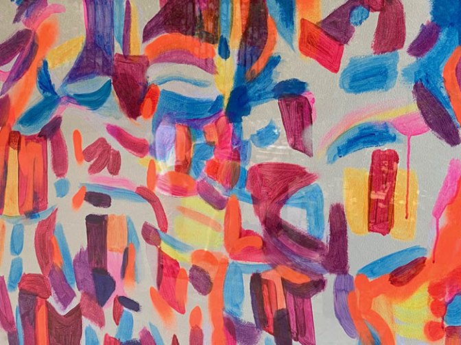 Dans cette intervention, l’artiste s’inspire de la vitrine comme le peintre utilise une toile. La couleur devient éclatante notamment sous l’effet des ultraviolets. Traitée en pleine pâte par de larges traits de pinceaux, raclée à la surface elle permet une grande variété de formes et de contrastes sous-jacents. La facture gestuelle associée aux couleurs primaires produit une impression d’énergie profuse et d’ambiguïté avec certains traits qui ne se relèvent que la nuit venue. L’œuvre se structure autour d’un axe formé par le tracé d’un vitrail délimitant différentes zones chromatiques et faisant écho aux vitraux de Jean Bazaine dans l’église de Saint-Séverin.