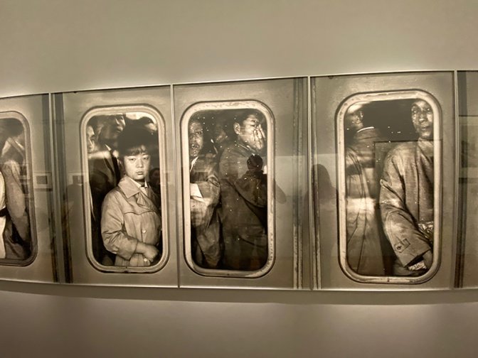 « C’est le métro de Hiro à Tokyo. Chaque fenêtre du wagon est une sorte de photo à l’intérieur d’une grande photo. Ça m’a suggéré tout ce que j’ai pu lire sur les trains qui partent en 42 vers les camps. C’est très rare aussi que, dans les photos non posées, on vous regarde. L’enfant si sérieux, les mains collées sur la vitre… On a l’impression que c’est un train fou avec l’humanité entière… »