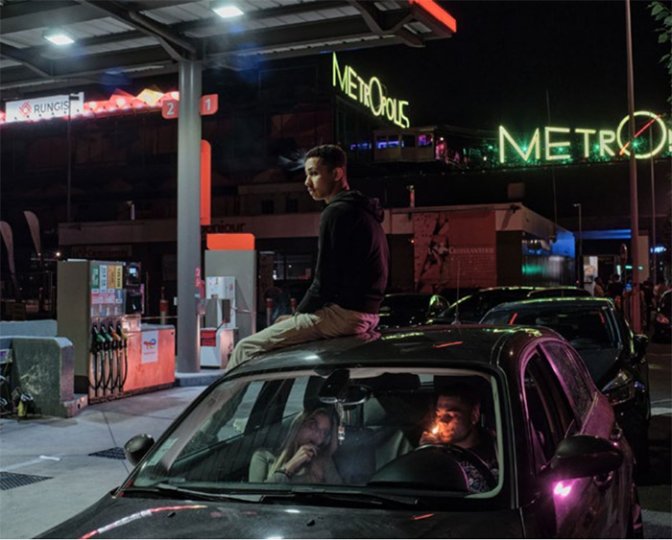 Mathias Zwick, Samedi soir à Rungis devant le Metropolis, une discothèque en bor- dure de l’A86. Dorian, Inès et Teddy font un « before » dans la voiture avant d’aller en boîte. Dorian : « Je suis carrossier, la voiture est aussi mon métier. Pour moi, la voiture représente tout : le voyage, l’oseille, la liberté ! » 26 juin 2022.