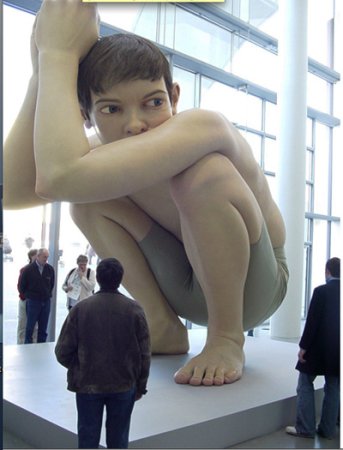 À travers ces personnages prostrés, fermés sur eux-mêmes, somnolant ou aux aguets, l´immense subtilité du travail de Ron Mueck réside dans l´évocation d´univers personnels et intimes, déplaçant vers la sphère psychologique les enjeux du réalisme artistique. » ( Robert Rosenblum)