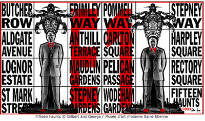 Un exemple : Gilbert et Georges dont les immenses tableaux photographiques en forme de vitraux mettent en scène leur propre vie et racontent des épisodes souvent crus de leur intimité. Humour et dérision traversent une réflexion philosophique sur l’homme moderne, son environnement, ses désirs, ses tares corporelles, et ses frustrations.