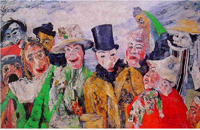 On pourrait donner à ces mannequins une filiation cousine, celle des masques et des carnavals tels que James Ensor a pu les peindre.