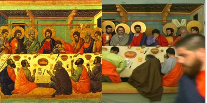 Il existe d’autres représentations de la Cène que celles utilisant le tableau de Léonard, et l’une d’entre elles est particulièrement profonde : une vidéo, 31 mn, de Andy Guérif (2007- Capricci Films) qui, en un unique plan-séquence fixe et frontal, enregistre méticuleusement le travail de treize ouvriers construisant intégralement le décor de La Cène, tableau de Duccio di Buoninsegna, où l’artiste fait les premiers essais de la perspective. Performance en temps réel, réflexion sur la création artistique en cours, séquence cinématographique interrogeant sans cesse le hors-champ, c’est une œuvre de la qualité de celle de Bill Viola, si vous avez la possibilité de la voir, courez !