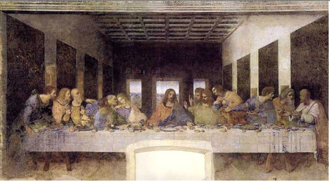 Techniquement, c’est une fresque de 4,6 m sur près de 9 m à la détrempe et à l’huile peinte dans un réfectoire du couvent de dominicain de Milan, Santa Maria delle Grazi. Ce sujet était fréquent dans la décoration des couvents, et servait à la méditation durant le temps du repas. De gauche à droite, on trouve Barthélemy, Jacques le Mineur, André, Judas, Pierre, Jean, Jésus, Thomas, Jacques le Majeur, Philippe, Matthieu, Thaddée et Simon. Cette œuvre est significative de ce qu’on a appelé la peinture des mouvements de l’âme. Vinci recommandait d’ailleurs dans ses écrits de peindre « les figures de telle sorte que le spectateur lise facilement leurs pensées au travers de leurs mouvements ». Thomas est ainsi peint comme sceptique avec son doigt levé, Pierre s’éloigne du Christ, Judas tient la bourse, etc. Tout est codé, y compris dans le cadre des interprétations théologiques et philosophiques du moment, les dominicains avaient fait du libre arbitre, du choix entre le bien et le mal par chaque individu des thèmes centraux, il s’agissait de garder Judas au milieu des douze et de lui conférer une position où, pleinement conscient de ce qu’il allait faire, il avait choisi le mal.