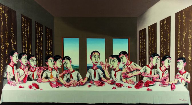 Ce tableau a défrayé la chronique après avoir fait l’objet d’une vente aux enchères dépassant toutes les cotes atteintes jusqu’alors par un artiste chinois. Mais son tableau très imposant par ses dimensions doit être aussi replacé dans l’œuvre et la vie de l’artiste pour en comprendre les codes. Né en province, Zang Fanzhi vint à Pékin pour faire ses études aux Beaux Arts dans les années 80. Il fut surpris de voir que les personnes de la rue n’affichaient aucune expression particulière et cachaient toute opinion dans ce pays totalitaire. Dans une attitude critique, mais ne risquant pas sa carrière, il prit alors l’habitude de respecter les codes de la peinture post-socialiste réaliste en revêtant tous les visages du même masque blanc, c’est donc lui et le genre humain qui sont représentés dans ses tableaux. Par ailleurs, dans une période difficile de sa vie, il parcourut son pays sans argent, réduit à manger des pastèques, fruit traditionnel de ce pays. C’est pourquoi, ce fruit à la chair rouge est souvent représenté dans ses peintures. Les foulards rouges des personnages font référence à un épisode de son enfance où il ne fut pas admis dans la jeunesse du parti (les scouts dirait-on), du fait de l’accusation portée contre son père d’être contrerévolutionnaire au moment de la révolution culturelle. Ces trois éléments font mémoire de sa vie personnelle, un écho peut-être au texte où Jésus demande de faire mémoire. D’autres détails donnent de la valeur à cette toile. Le ciel du fond et les calligraphies des murs font directement référence à toute l’iconographie de la peinture classique chinoise. Judas, lui, est représenté avec une cravate dorée, signe du pouvoir de l’argent ,et dans la figure de l’homme d’affaires contemporain, la forme de capitalisme adoptée par la Chine. La critique implicite du tableau est forte et dénonce ainsi la traîtrise du Parti vis à-vis de toute une civilisation traditionnelle.