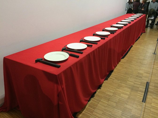 Une Cène pour treize convives dont on ne voit que les couteaux et fourchettes tous identiques, sur une nappe impeccablement rouge révolution.