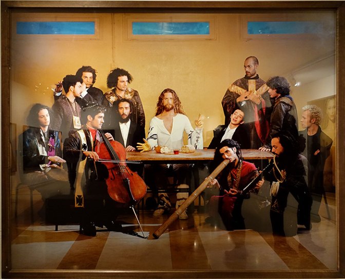 La Cène fait l’objet d’une interprétation baroque où tout se joue dans les vêtements pour représenter les situations psychologiques des apôtres à ce moment clef : des apôtres musiciens, un Christ raide et très réflexif en habit sacerdotal contemporain si éloigné du vêtement casual porté par un modèle resplendissant incarnant Jésus. Est-ce un jugement, par moyen visuel interposé, de la distance entre le clergé d’aujourd’hui et ce qu’il est censé incarner ?