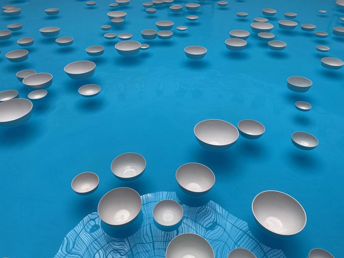 Des bols de tailles différentes en porcelaine blanche contrastant avec le bleu, mus par un courant léger, générant des sons cristallins. Célestes si l’on peut rapprocher cette expérience multisensorielle du prénom du plasticien ? Ces beaux objets se transforment ainsi en instruments et créent une symphonie de l’instant.