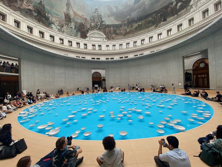 Ici, l’œuvre est d’une ampleur inédite, 18 m de diamètre, à l’échelle de la coupole de la Bourse de Commerce, bien loin des bassins de 2 m des débuts de l’artiste qui provoquaient déjà la fascination. S’il avait créé sa première œuvre avec une piscine gonflable dans sa cuisine, désormais c’est autour d’un bassin en bois construit pour l’occasion que l’on peut s’asseoir.