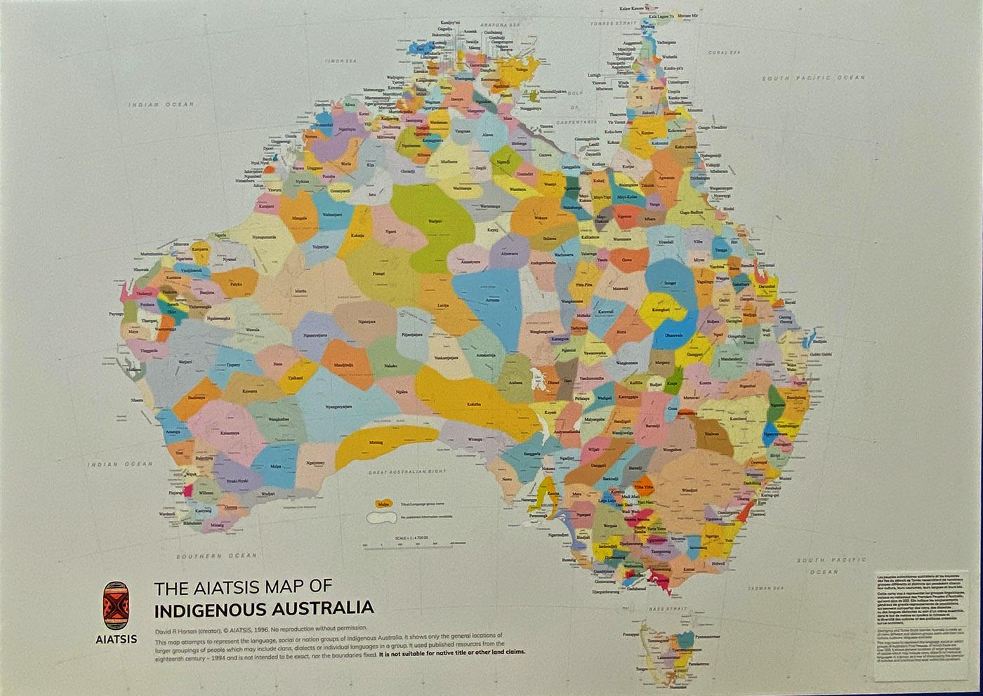 L’esprit est différent pour la scène australienne, car il y est traité de la complexité d’un continent et de la multiplicité des peuples premiers (250 groupes linguistiques ou countries). Ces derniers utilisent le terme « country » pour décrire non seulement les territoires mais les terres, les cours d’eau, les mers et le cosmos auxquels ils sont reliés et dont les peuples prennent soin.