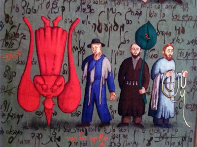 Il s’agit d’une plongée fantastique dans la kabbale avec un texte en toile de fond tiré du Tanya, livre fondateur du hassidisme de Loubavitch, mais rendu indéchiffrable par la graphie. Tout est symbolique et attise le regard et la curiosité. Chaque personnage est porteur d’un accessoire dont la signification est donnée dans un lexique rédigé par l’artiste et mis à la disposition du visiteur.