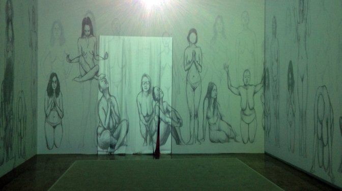 « Mutumia » de Phoebe Boswell, exposée dans le cadre de Future Generation Art Prize dans le vaste Palazzo Contarini, est une installation interactive dans laquelle de grands dessins de corps nus prennent vie en fonction de nos propres mouvements.