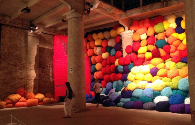 Autre appropriation grandiose de l’espace, les pelotes en laine monumentales et multicolores de Sheila Hicks dans lesquelles on voudrait se blottir.