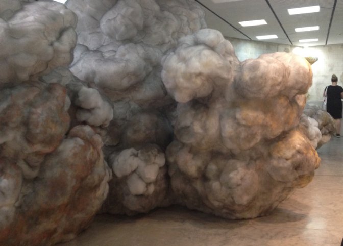 C’est l’architecture même qui devient paysage dans le pavillon israélien où l’artiste Gal Weinstein propose une installation à même le sol et les murs de plaques de laine de verre altérées imprégnées de café. La sensation inonde tout l’espace telle l’énorme nuage sculpté aussi en laine occupant tout l’étage.