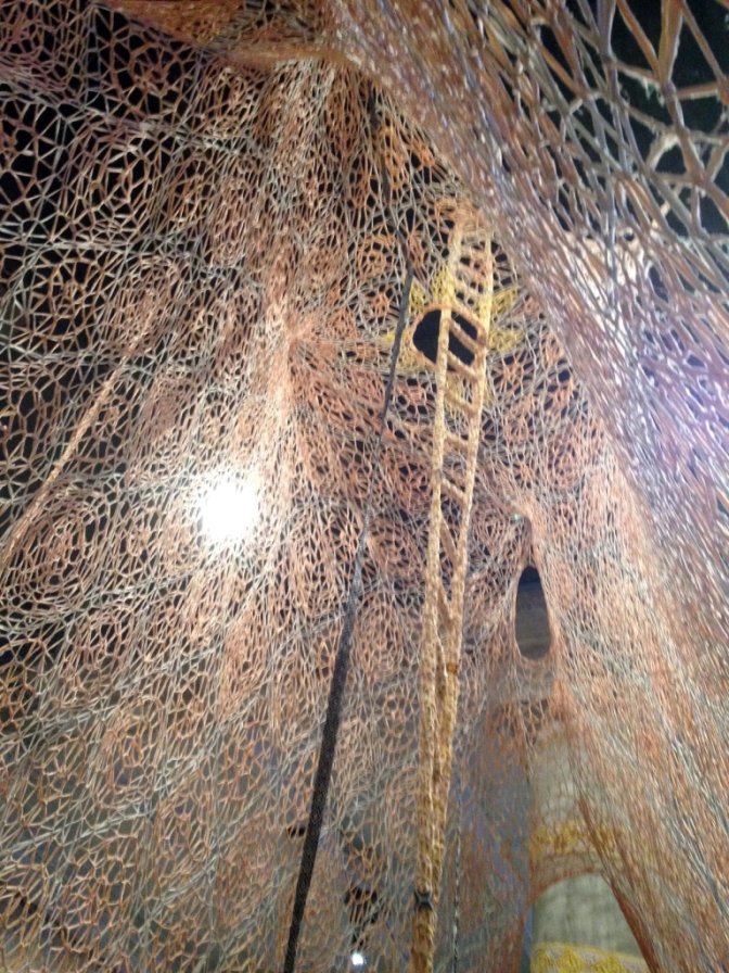 Organisée en 9 sections thématiques (appelés « pavillons »), elle regroupe 120 artistes originaires de 51 pays. Du « Pavillon des artistes et du livres » au « Pavillon du temps et de l’infini », le spectateur est invité à découvrir un vaste territoire peuplé d’œuvres inédites produites pour l’occasion par les plus grands noms de la création contemporaine. A l’Arsenal, Ernesto Neto avec José de Lima, dans le « Pavillon des chamanes », réalise une installation immersive inspirée de rituels chamaniques amérindiens, sous la forme d’une tente monumentale tissée en crochet abritant des couchages de méditation et des plantes.