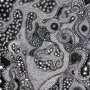 « à la Recherche de la Matière… » : simultanément par le plus grand des hasards, en face de Saint-Merry, au Centre Pompidou, sont présentés, jusqu’au 31 mars, de nombreux dessins provenant de la donation exceptionnelle Florence et Daniel Guerlain, composée de 1200 œuvres. Il est alors possible, non pas de comparer, mais de situer les œuvres d’Yves Lefebvre dans la variété des types contemporains. À Saint-Merry, on n’est pas face à une diversité des matériaux (tissus, cartons, bois, etc.), il n’y a pas de narration non plus d’un dessin à l’autre, pas de suite, seulement parfois un personnage, des objets numérotés. Si cette série est le résultat d’une véritable « recherche » de plusieurs années, le titre reflète une intention forte de l’artiste, une quête impérieuse, l’utilisation de la majuscule signifiant une personnalisation. Ses amibes et ses volutes imaginaires, autant de matières à dessin, seraient-elles des sujets et non des objets ? Sans aucun guide d’explication, le visiteur doit lancer lui-même son regard et chercher. Mais quoi ? Le visiteur ne peut sortir du piège de la phrase de titre qu’en observant les détails. Ainsi un dessin semble dessiner une grande voûte étoilée, irréelle tant elle est géométrique, mais faite de poussières de matières. « Dieu est dans le détail » disait l’architecte Ludwig Mies van der Rohe (1886-1969).