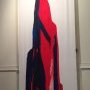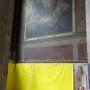 Avec un sens poussé du décor théâtral, l’artiste fait déborder son installation de l’espace confiné d’une chapelle décorée au XIXe en accrochant en face une très grande toile rouge, une montagne de 5m de haut : « Golgotha ». Du monde de Gulliver, il passe brusquement à une autre échelle, celle de l’église. Le visiteur surplombant le monde jaune et bleu est alors dominé par le roc rouge. Le sacré change de dimension et vire au tragique.