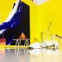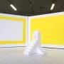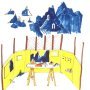 La Fabrique de la Montagne Sacrée »Thibault Lucas entretient avec la nature des relations de fascination, qu’il la représente par un ensemble de rochers, une forêt, des champs, la mer ou la montagne. Cet artiste, né en 1984, vivant et travaillant à Paris, crée avec un minimum de moyens : du papier, des couleurs primaires, des matériaux pauvres contemporains comme le polystyrène. En fait c’est le monde qu’il explore, avec des yeux d’enfant ou d’adulte à l’insatiable curiosité, et qu’il représente en puisant dans l’imaginaire et le symbolique. La question du sacré le taraude ; il invente une réponse de manière plastique en jouant sur les échelles de ses objets et de ses dessins, en faisant référence à de multiples cultures, égyptienne, inca, médiévale. Il croise, il fragmente, il assemble, il est toujours en mouvement. La preuve : il avait déposé pour Saint-Merry un projet d’installation sur la forêt, tout de bleu, porté par une musique contemporaine : « Forêt enchantée » ; il arrive avec un projet sur la montagne tout en jaune flashy, silencieux : « La Fabrique de la Montagne Sacrée ». Le point commun : une vision à la Jonathan Swift, ici non pas en vue d’une satire sociale, mais d’une ouverture à l’émerveillement.