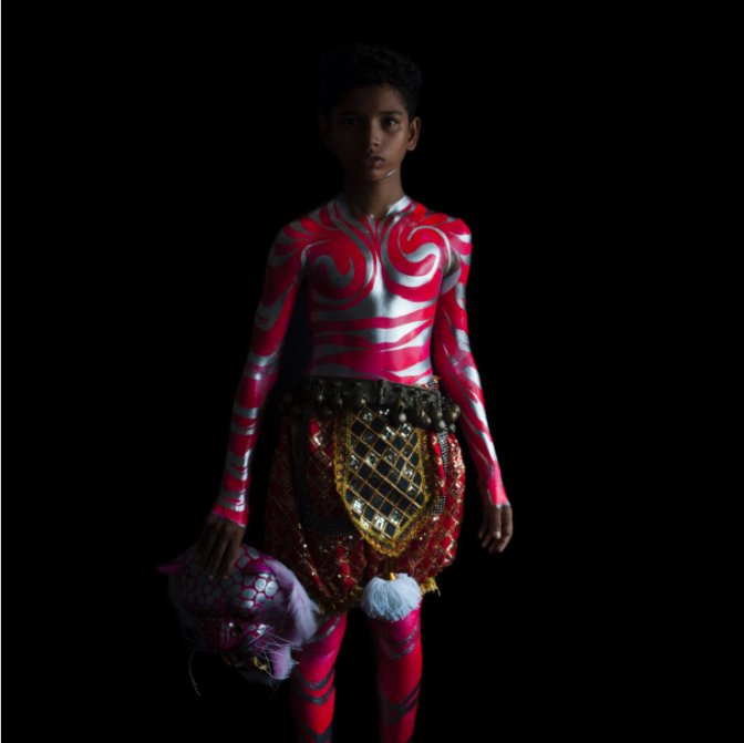 Iwajla Klinke cherche à rendre visible ce qui n’est pas visible dans la pleine lumière de l’espace publique. Elle suggère plutôt par son titre, Hemeralopia, de familiariser sa rétine au secret des transformations des identités. Le sombre est partout mais il n’est pas tragique. Il est le propre de certains sujets comme l’aveugle footballeur. Il est volontaire comme chez la veuve de Hambourg. Il devient un attribut essentiel dans la décoration des jeunes garçons qui se transforment en tigres à l’occasion d’une journée de célébration de la nouvelle saison, qui se peignent le corps et performent dans les rues une sorte de danse urbaine ressemblant au breakdance new-yorkais des années 70, avec des figures acrobatiques au sol.