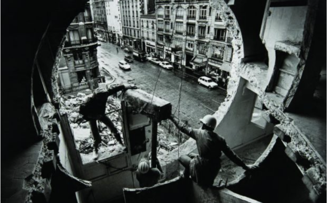 Gordon Matta-Clark, urbaniste et « anarchitecte », avait découpé, en 1975, deux cônes imbriqués dans deux immeubles voués à la démolition devant Beaubourg en construction : le génie civil au service d’un monde en chute. Le photographe Georges Rousse, lui, a travaillé dans les immeubles en ruine en croisant architecture, peinture, photographie par l’anamorphose afin de troubler le regard : une invitation à dissocier le faux du vrai de l’image. La matière permanente de son œuvre est l’Espace, qu’il révèle ; sa réflexion porte sur le temps et la mémoire des bâtiments dégradés, leur course vers l’oubli et la mort. Mais il y a aussi une dimension spirituelle : avant la destruction de l’espace se produisent une transmutation et une transfiguration éphémère .