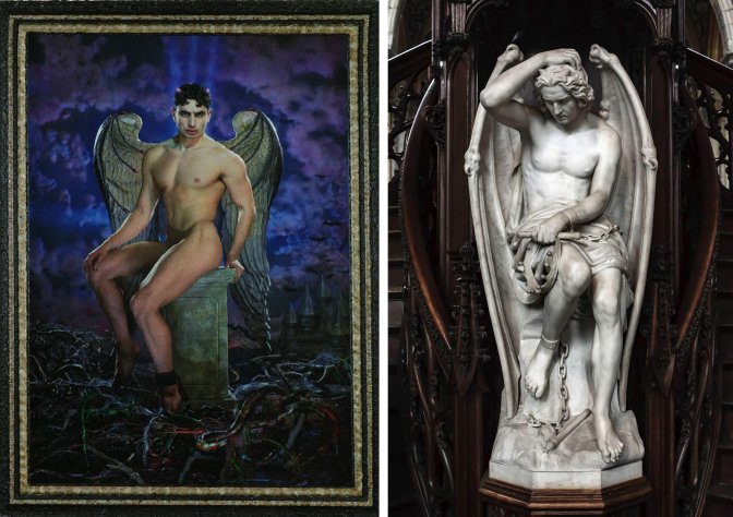 La question du mal occupe une place récurrente dans l’œuvre de Pierre et Gilles. Cette photo sombre, dont le modèle est un mannequin de la scène gay, fait explicitement référence à une sculpture qui a fait scandale, l’Ange déchu, œuvre de Joseph Geefs, commandée et installée en 1842, puis refusée par l’évêque. Paradoxalement, elle fut remplacée par le Lucifer de son frère Guillaume Geefs, une statue de marbre plus provocatrice encore, installée en 1848 au centre de la chaire de la cathédrale Saint-Paul de Liège. À une époque romantique où l’esprit gothique réhabilitait Lucifer, il s’agissait d’exprimer la victoire de la religion sur le mal. Pierre et Gilles ont donc proposé à Jean-Louis Le Floch de jouer le personnage avec les mêmes ailes et la chaîne au pied. Contrairement au modèle du XIXe, pas de larme. (https://unebrevehistoiredart.com/2021/08/15/scandale-a-la-cathedrale-une-sculpture-controversee/ ) Cette photo montre avec humour que leur art sait citer des œuvres officielles de l’Église, et qu’ils sont dans la continuité et dans l’esprit du temps, celui des jeunes, ceux qui ne viennent plus à l’église…