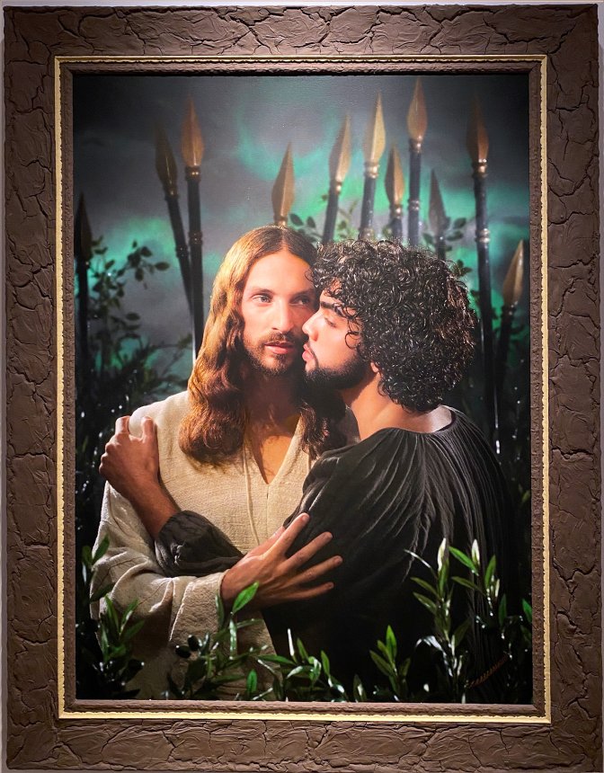 Cette photo, dont les modèles sont des mannequins connus, est la plus proche des représentations religieuses traditionnelles, avec des codes très prudes (pas de nu, Jésus en blanc, Judas en noir) et des lances en arrière-plan. Elle est belle et tout en retenue. Une rencontre entre deux hommes sur le mode du hug contemporain, importé des milieux gay, traduisant une tendresse et une reconnaissance analogues à celles dont parlent les artistes à propos des rencontres avec leurs modèles en atelier. Le prénom du modèle principal, Jesus, a probablement pesé dans le thème de la photo. Cette œuvre peut être perçue comme une illustration très fidèle des textes de saint Marc ou de saint Luc. Le modèle incarne le personnage de Jésus, alors que Instagram le présente tout autrement, dans un milieu de mannequins gay. Les interprétations sont ouvertes : Peut-on relier le regard de la photo de 2021 aux paroles de Luc 22.48, dans une sensibilité gay : « Judas, c’est par un baiser que tu livres le Fils de l’homme ? »