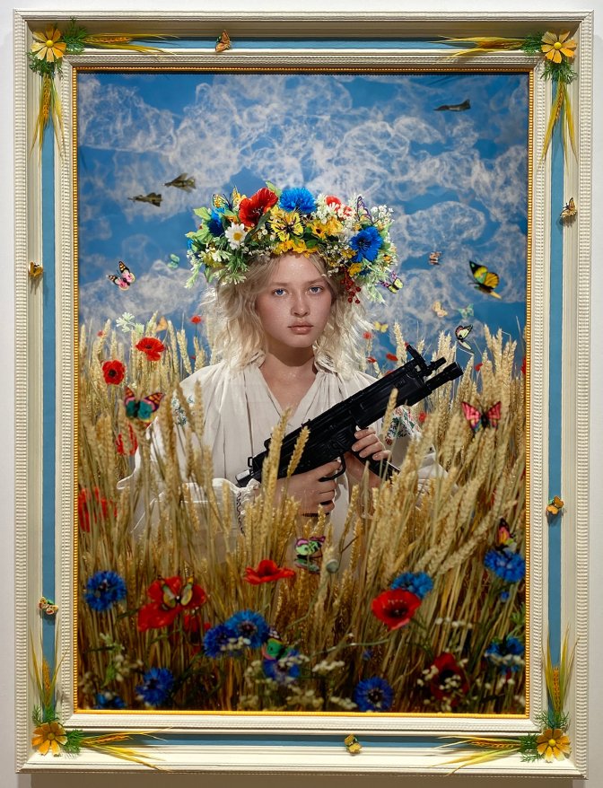 Ce tableau a des traits proches du précédent. Avec son nom associé au titre, cette jeune femme, qui n’est plus une anonyme, a sa part dans la construction de l’œuvre. Ici, pas de référence religieuse explicite, mais essentiellement des attributs ukrainiens, le blé et la couronne de fleurs portée dans les fêtes populaires, y compris religieuses. Sa jeunesse est arrêtée par la guerre, mais son regard et son port d’une arme (factice), tandis que les avions dans le ciel qui se substituent aux papillons, témoignent de son chagrin, mais aussi de la fermeté de son choix de combattre. À côté des coquelicots rouges, les bleuets de France, signes de la mémoire et de la solidarité envers les anciens combattants. Alors que leurs tableaux sont généralement dans une ambiance Queer, ici pas de nudité, le sujet est grave. Olga est habillée simplement, les propos des artistes se concentrent sur la guerre, mais avec une espérance dont témoigne le cadre aux couleurs de l’Ukraine, avec épis, fleurs et papillons. Même au cœur de la guerre, Pierre et Gilles mettent de la beauté, de l’espérance et introduisent une profondeur dans leur esthétique pop, très maitrisée. Ils accordent aux femmes une place égale, ce qui est un trait de l’art des deux artistes.